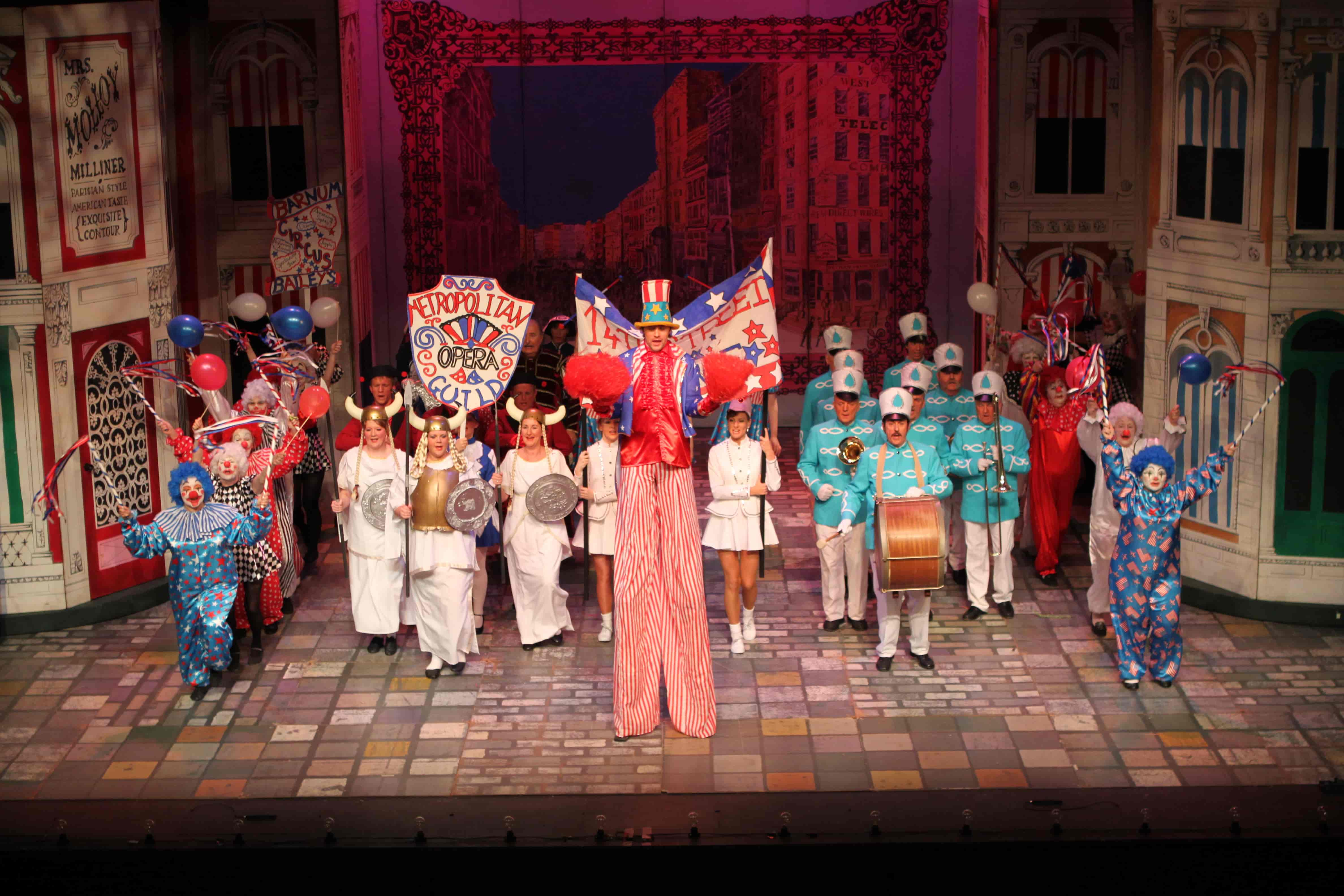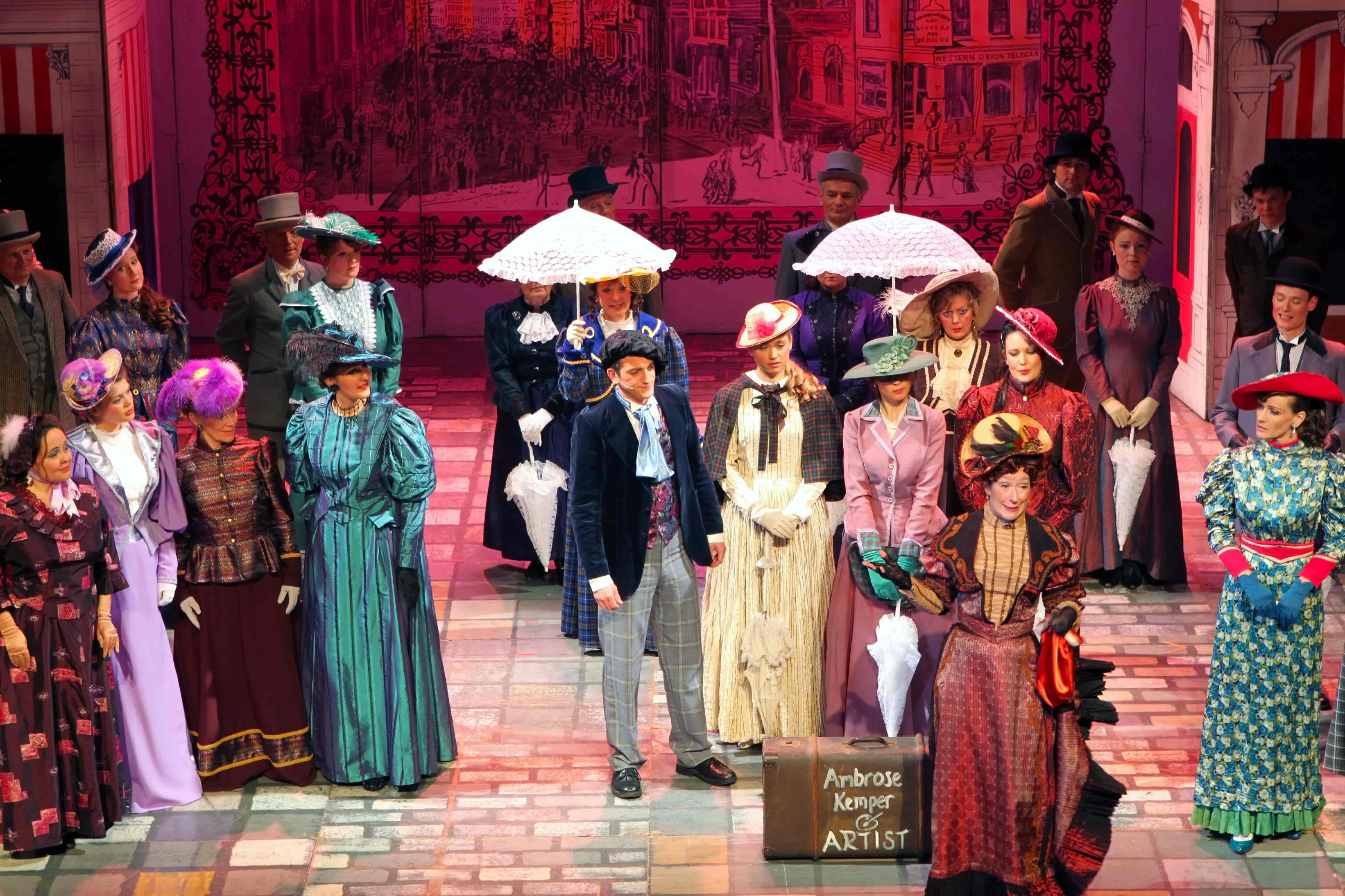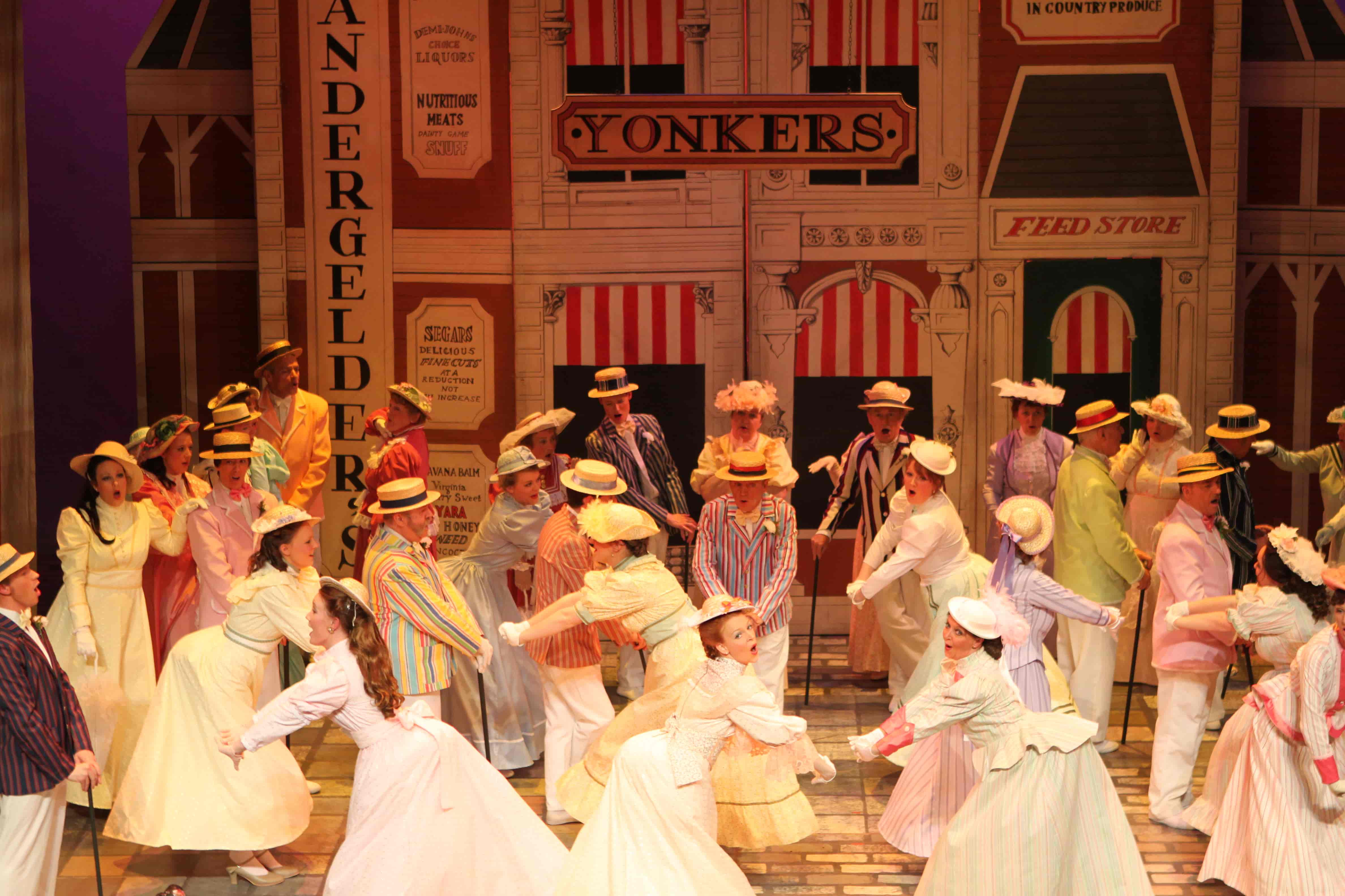 Our wardrobe for Hello Dolly includes stunning gowns for Dolly Levi; a beautiful set of assorted pastel dresses and blazers for Put On Your Sunday Clothes; a red, white and blue parade set for Before the Parade Passes By; and tailored red tails for the waiters in the famous Harmonia Gardens Waiters' Gallop scene.