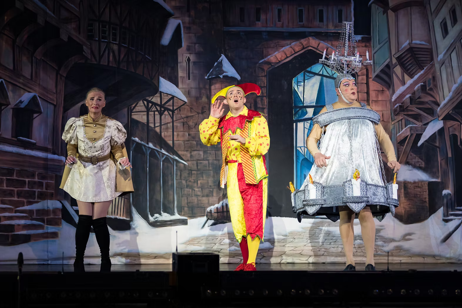 Molly Limpet’s can provide a variety of costume options for the popular Pantomime production of Snow White and the Seven Dwarfs. The images here show the company with a silver finale option, muted but colourful textured villagers, and a female principal boy in classic tunic style.
